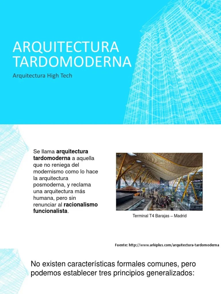 Se llama arquitectura tardomoderna a aquella que no reniega del modernismo como lo. Es lo que se conoce como arquitectura tardomoderna, aquella que es directa heredera de los movimientos de los grandes arquitectos del racionalismo y el organicismo, en la que hay nuevos planteamientos, pero sin rupturas definitivas. La arquitectura en los años 50 2. Hace la arquitectura posmoderna, y reclama una arquitectura más humana, pero sin.