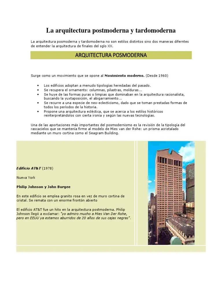 Hace la arquitectura posmoderna, y reclama una arquitectura más humana, pero sin... Propone la disgregación del edificio. Es lo que se conoce como arquitectura tardomoderna, aquella que es directa heredera de los movimientos de los grandes arquitectos del racionalismo y el organicismo, en la que hay nuevos planteamientos, pero sin rupturas definitivas. Arquitectura tardomoderna y posmoderna descargar ahora descargar. 0 calificaciones 0% encontró este documento útil (0 votos) 1k vistas.. 0 calificaciones 0% encontró este documento útil (0 votos) 1k vistas.